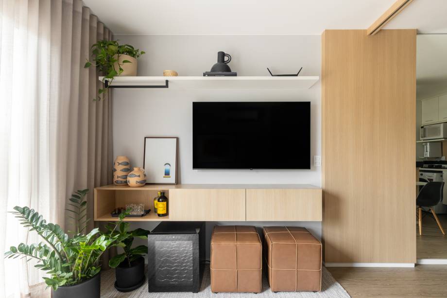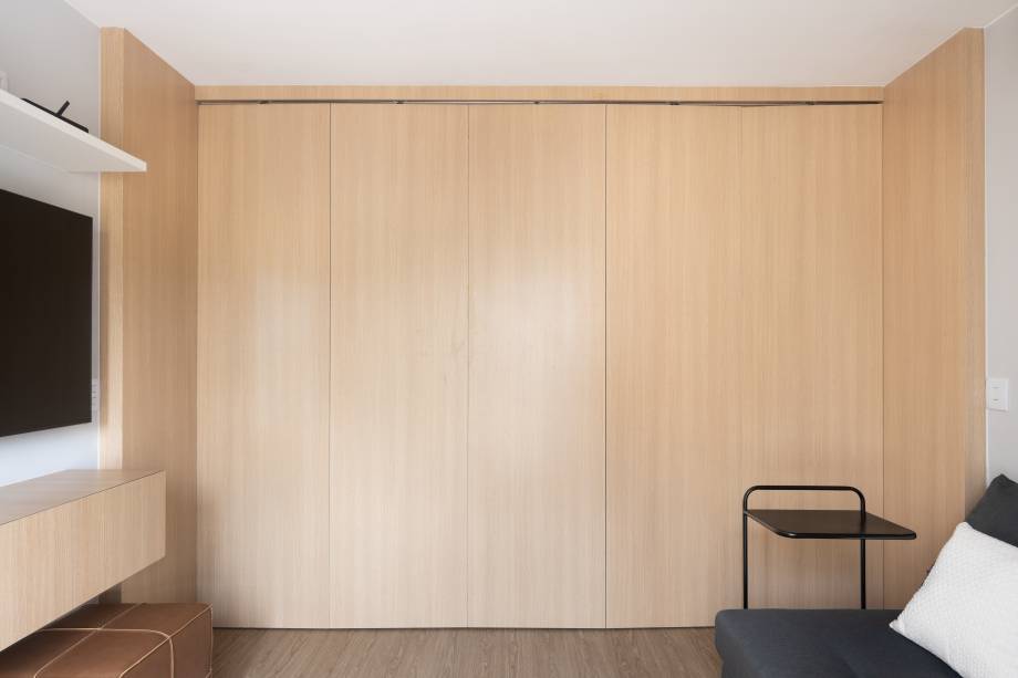 Painéis articulados de madeira separam a cozinha da sala de estar, que pode ser quarto