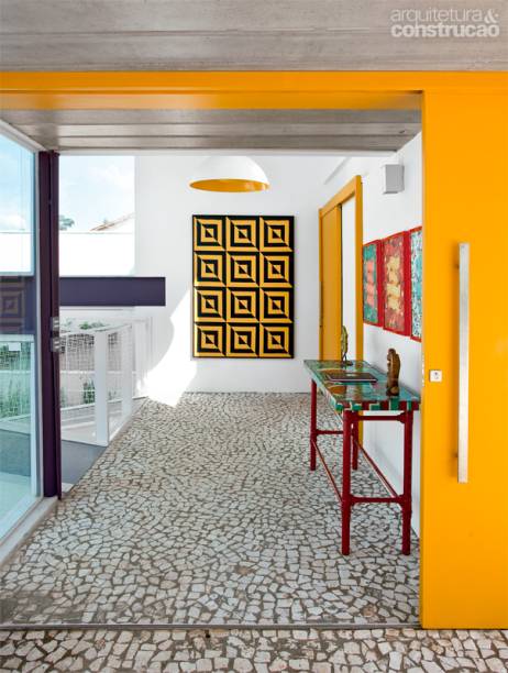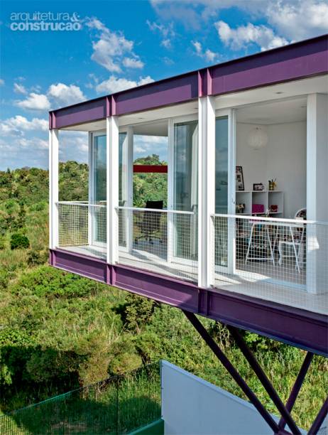 O privilégio de ter a natureza aos pés não foi obra do acaso. Multiplicamos o uso do vidro e, para conseguir vãos livres generosos, elegemos a estrutura metálica”, explica o arquiteto Bernardo Telles, de Campinas, SP, convidado para tocar o projeto e a execução. O sistema construtivo permitiu criar grandes trechos quase sem apoios, como os dois ateliês que parecem flutuar sobre a piscina, e agilizou a empreitada: em sete meses, toda a armação metálica ficou pronta. “Essa opção custa um pouco mais caro que o concreto armado. Até 20%, aproximadamente. Em contrapartida, você ganha com a racionalização das etapas, além de evitar o desperdício de material”, completa o arquiteto. Nos trechos onde era crucial reduzir o peso sobre os perfis de metal, o fechamento leva placas cimentícias, e as paredes são de drywall. O resto da casa empregou os tradicionais blocos de concreto. Inteligência construtiva à parte, este projeto também pode se gabar de uma implantação bem pensada. Sem a necessidade de uma terraplanagem radical, a construção se organiza em três patamares e vence os 7 m de declive. “A ideia era evitar grandes diferenças de nível ao longo do lote”, argumenta Bernardo. Aberta para os fundos e uma das laterais, a morada aproveita a face norte e é iluminada pelo sol o dia todo. Por isso, os quartos, alocados no piso superior, ajudam a fazer sombra. Já a lateral cega, com parede de blocos de concreto aparente e sem janelas, fica voltada para a face sudoeste. “Ela serve de proteção contra os ventos e as chuvas mais fortes”, complementa. Na distribuição da planta, o térreo, no mesmo nível da rua, concentrou a garagem, o hall de entrada e a lavanderia. Atendendo ao pedido dos moradores, nada de escadas para descer até os pavimentos inferiores, onde estão as áreas de convívio, ou subir até a ala íntima, que reúne, com privacidade, os quartos e os ateliês do casal. “O percurso acontece por rampas. Sempre gostei desse tipo de circulação, que me faz lembrar os lugares públicos”, diz o proprietário. Formado em administração e atualmente estudante de jornalismo, ele também já cursou dois anos de arquitetura. Fã de tudo que é inovador, não foi difícil para ele aceitar as propostas ousadas do arquiteto – e contribuir com elas, como aconteceu na escolha da incomum paleta de cores. “Elas quebram o cinza dos outros materiais. O amarelo e o roxo trazem alegria e felicidade. Exatamente o que temos de sobra aqui”, resume.