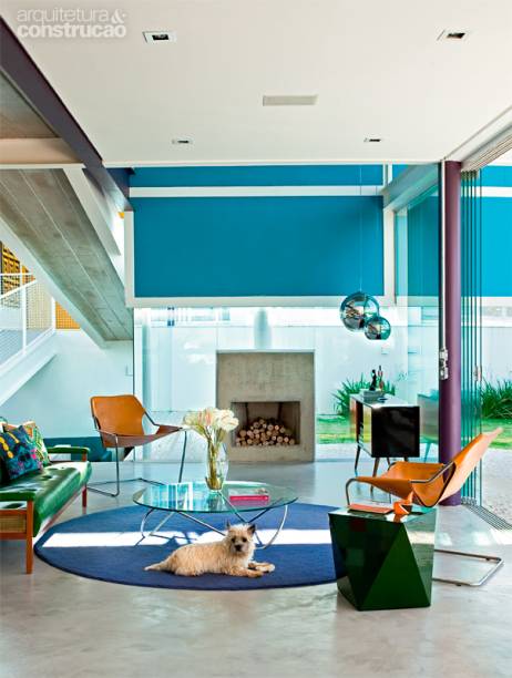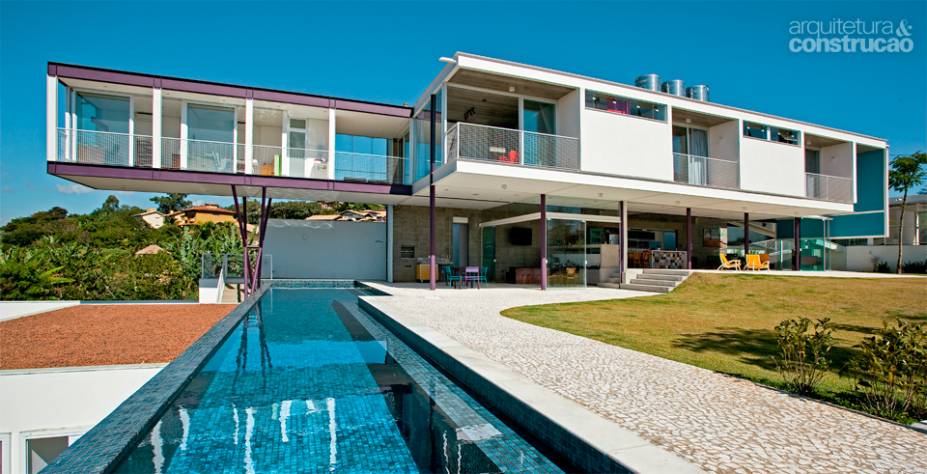 Esta casa no interior paulista tira partido da estrutura metálica e de grandes painéis de vidro. Presentes até em vigas e pilares, cores fortes arrematam o resultado