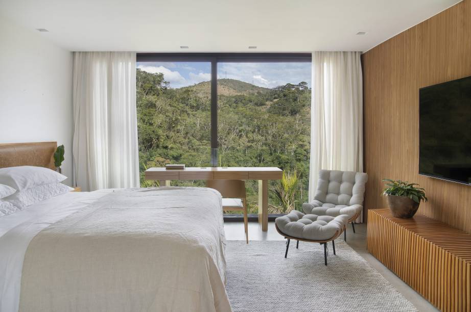 “Esses materiais reforçaram ainda mais a conexão dos espaços internos com a natureza exuberante ao redor”, justifica Raposo. Já a lareira da sala ganhou detalhes em aço cortén, enquanto a cozinha conta com armários de aço inox e bancadas de quartzo cinza.