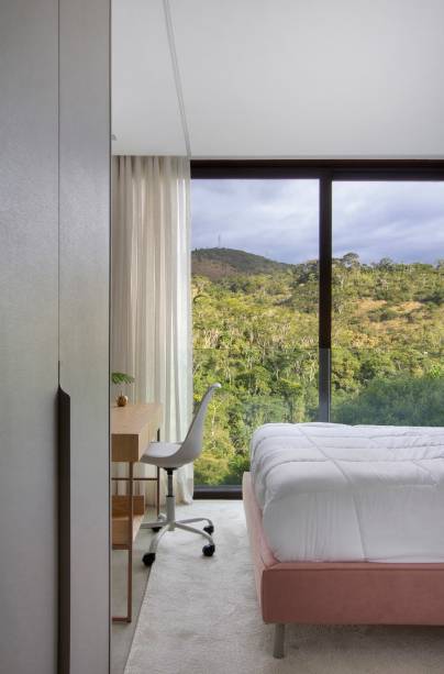 Na suíte do casal, o destaque fica por conta da mesa de trabalho de frente para a vista externa, as esquadrias com isolamento acústico e o box do banheiro com esquadrias de vidro do piso ao teto (com venezianas móveis, para garantir privacidade), também voltadas para a área externa.