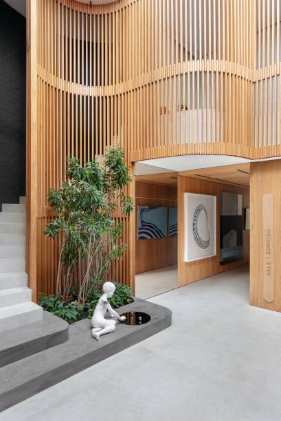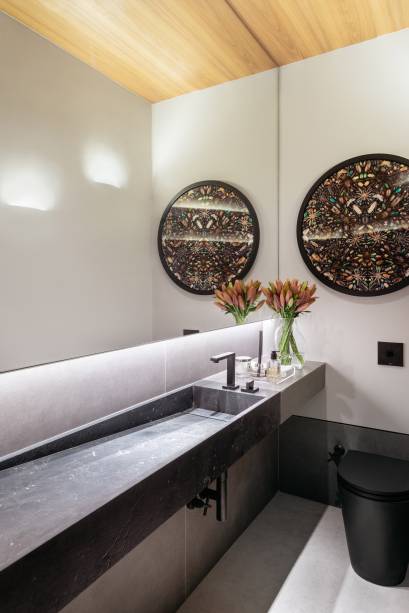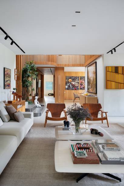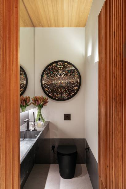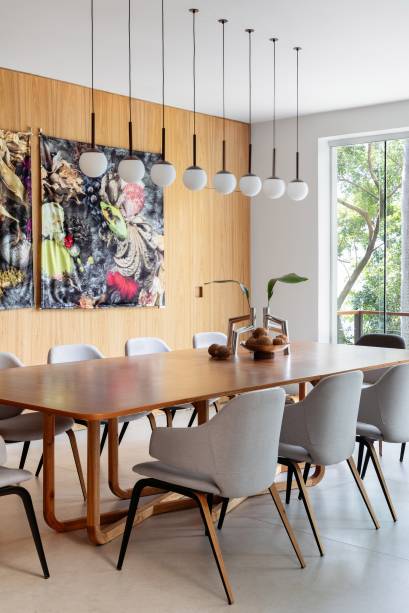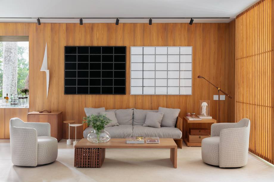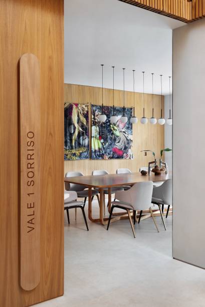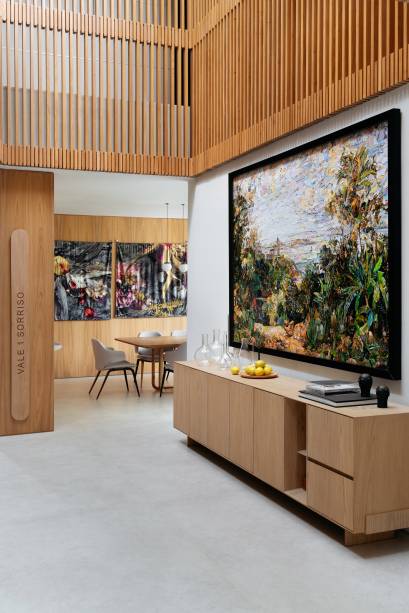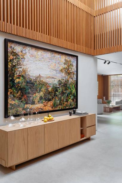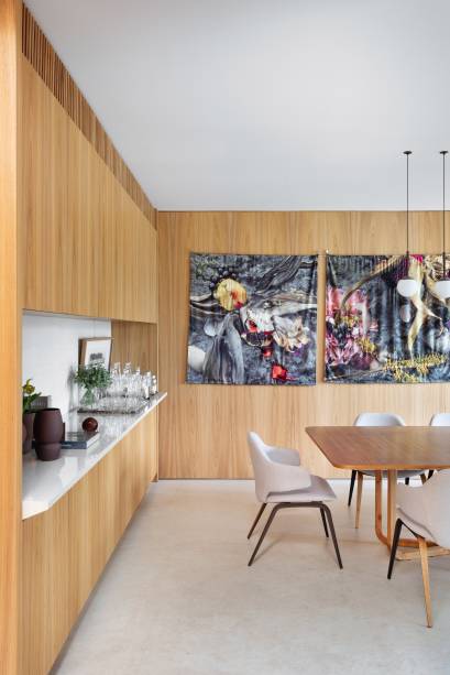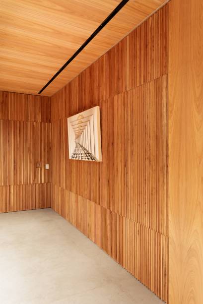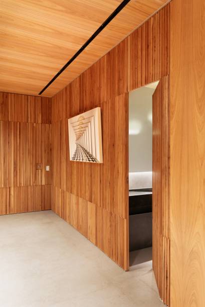 Em busca de conforto visual e tátil, na marcenaria, eles apostaram em lâminas de freijó natural nas salas, alternando painéis lisos e ripados. “Este foi, inclusive, o ponto de partida para a definição da galeria na entrada da casa. Criamos um conjunto em marcenaria que perfaz paredes e teto para abrigar parte da coleção de arte dos clientes e utilizamos um detalhe canelado para identificar as portas de entrada, de cozinha e de lavabo”, explica o arquiteto Maurício.
