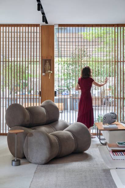 “A ideia era fazer com que a sala ficasse mais convidativa e que o layout permitisse reunir várias pessoas, pois os clientes gostam muito de receber em casa. Eles também queriam uma renovação completa de materiais e revestimentos para deixar os ambientes com um ar mais moderno e aconchegante, ao mesmo tempo”, acrescenta a sócia Alice. Não houve modificações na planta original, apenas foi ampliado o vão de acesso à sala de jantar.