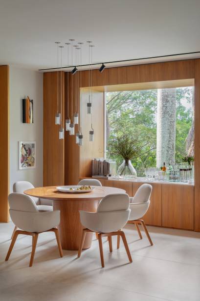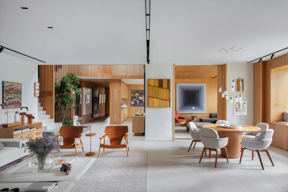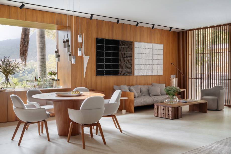 O escritório Magarão + Lindenberg Arquitetura apostaram na madeira para criar sensação de amplitude e fluidez na área social de 250m² da casa