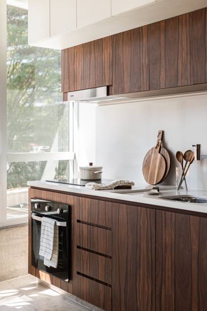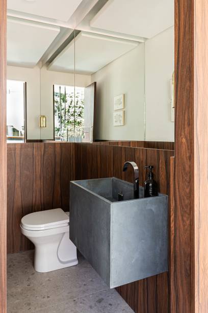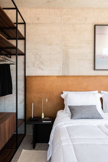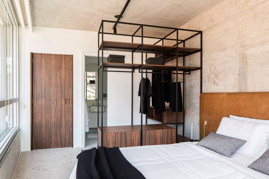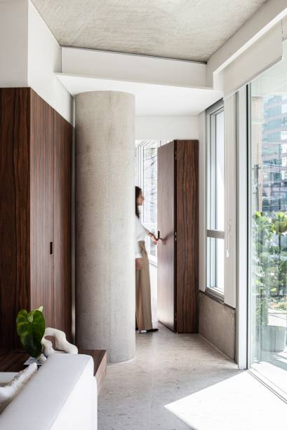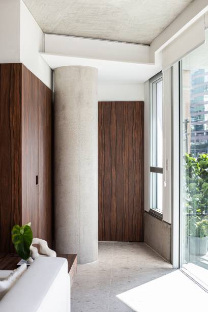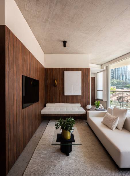 Painéis em madeira pau ferro contrastam com laje de concreto neste apê