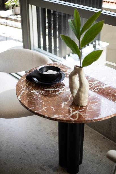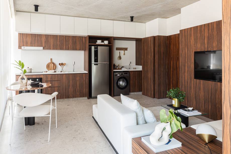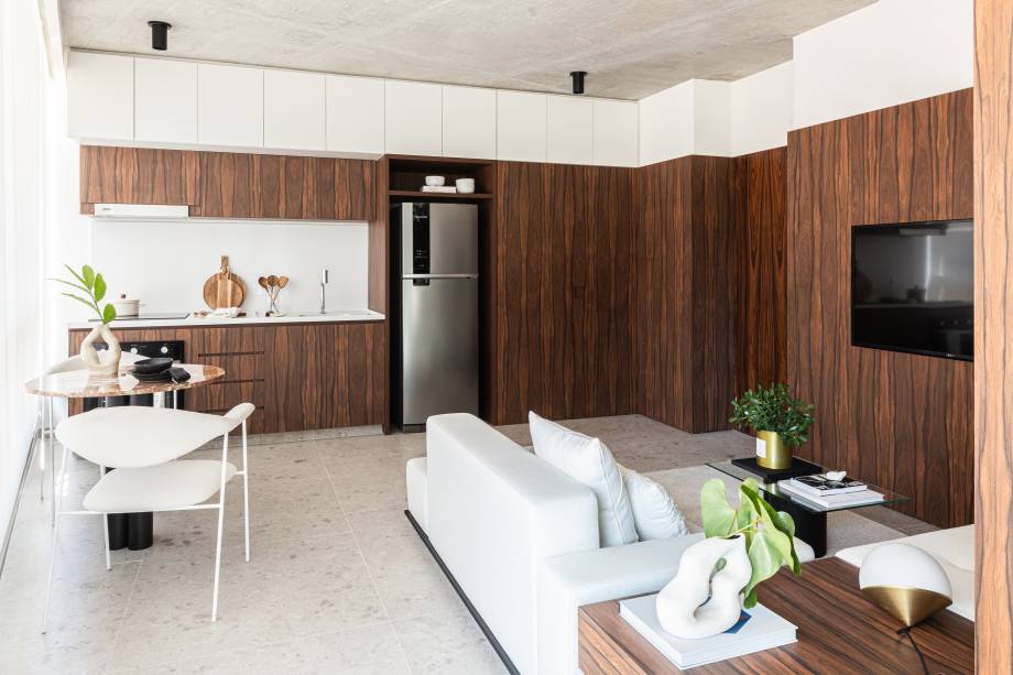 O Estúdio Pluri criou um refúgio de elegância e beleza com layout integrado, com couro, linho, mármore e vidro.