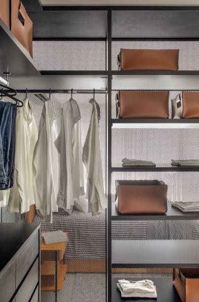 Já na suíte do casal, o closet em chapa vazada foi projetado para não reduzir o ambiente, enquanto uma parede em verde musgo adiciona um toque jovial e sofisticado.