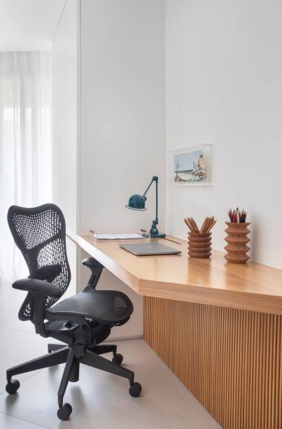 No escritório, a criação de uma bancada chanfrada que se integra à abertura das portas dos armários, não comprometeu a circulação e criou uma área mais livre. “Nosso maior desafio foi lidar com a planta original e seus ângulos irregulares. Optamos por soluções personalizadas, como o mobiliário feito sob medida, que não só otimiza o espaço como trouxe um acabamento mais limpo e coerente com a estética geral da moradia”, diz Alexia.
