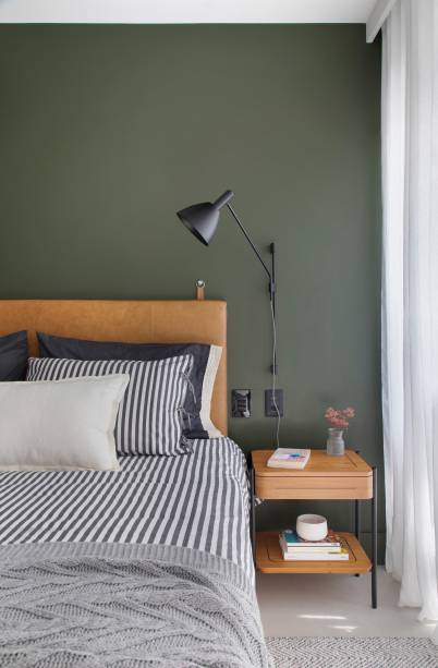O escritório MAR Arquitetura optou por uma base neutra junto de um piso em porcelanato. No quarto, o closet em chapa vazada ganhou uma parede verde musgo.