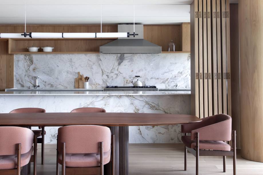 Para aumentar a sensação de amplitude e reforçar a unidade visual do setor social, a paleta cromática e os materiais da cozinha seguem o padrão adotado no setor social. “Embutimos os refrigeradores na marcenaria para deixar a cozinha bem clean e minimalista”, ressalta Solange.
