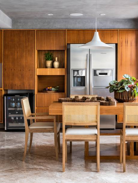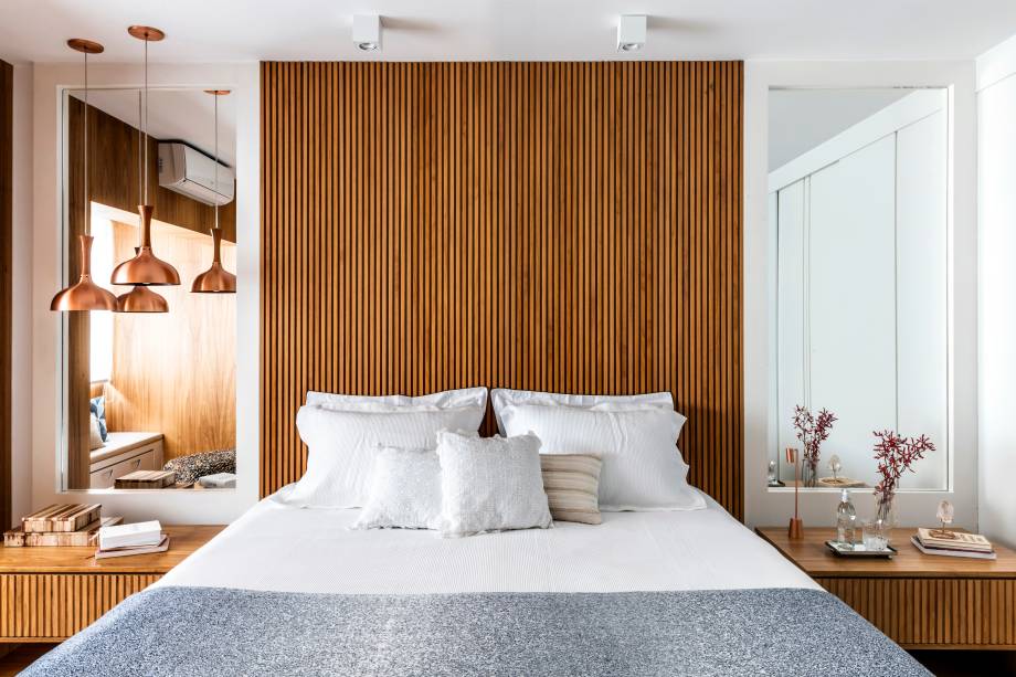 Painel e forro de madeira escondem a área íntima deste apê de 297 m²