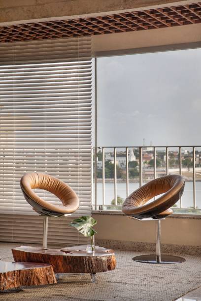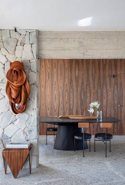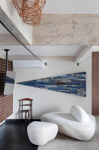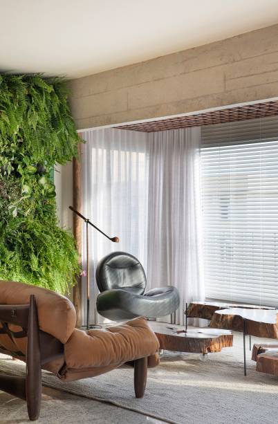 Na decoração, os principais móveis assinados da área social são clássicos do design brasileiro que já faziam parte do acervo do casal, como o sofá Mole (de Sergio Rodrigues), a mesa lateral Pétala (de Jorge Zalszupin), as cadeiras de jantar Torno (de Gustavo Bittencourt) e o par de cadeiras Anel e a poltrona Kudasai (ambas criações de Ricardo Fasanello).