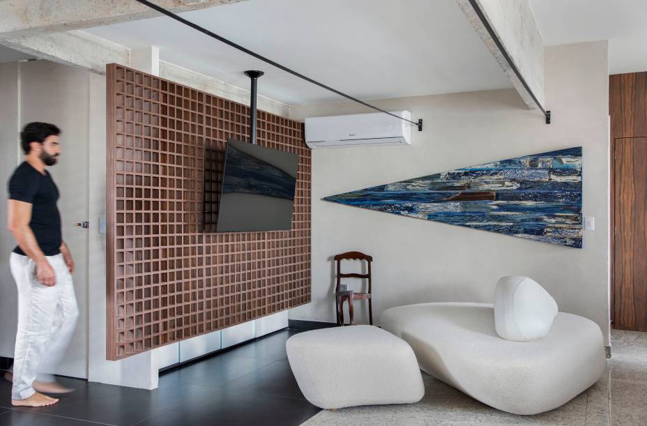 Painel vazado em forma de muxarabi é destaque na sala de TV deste apê