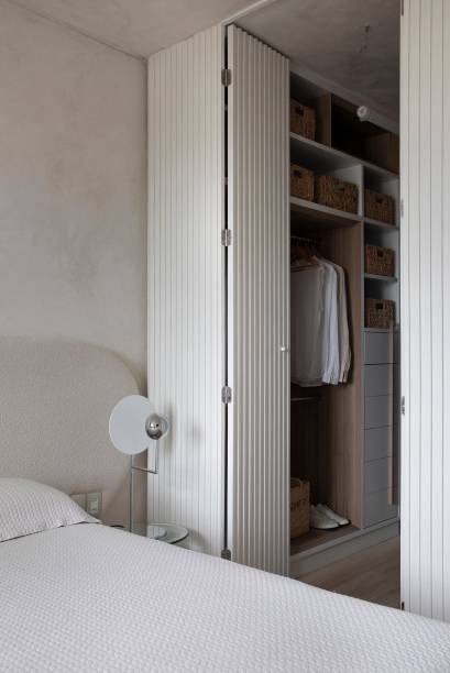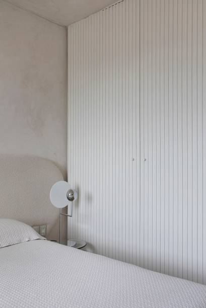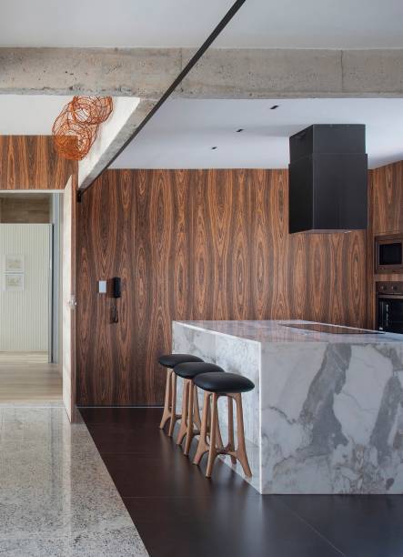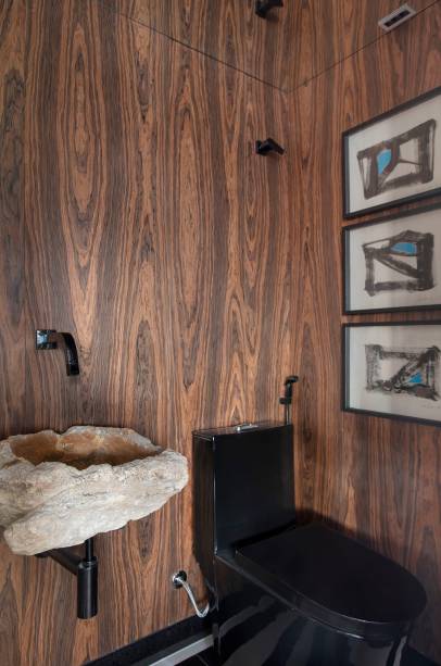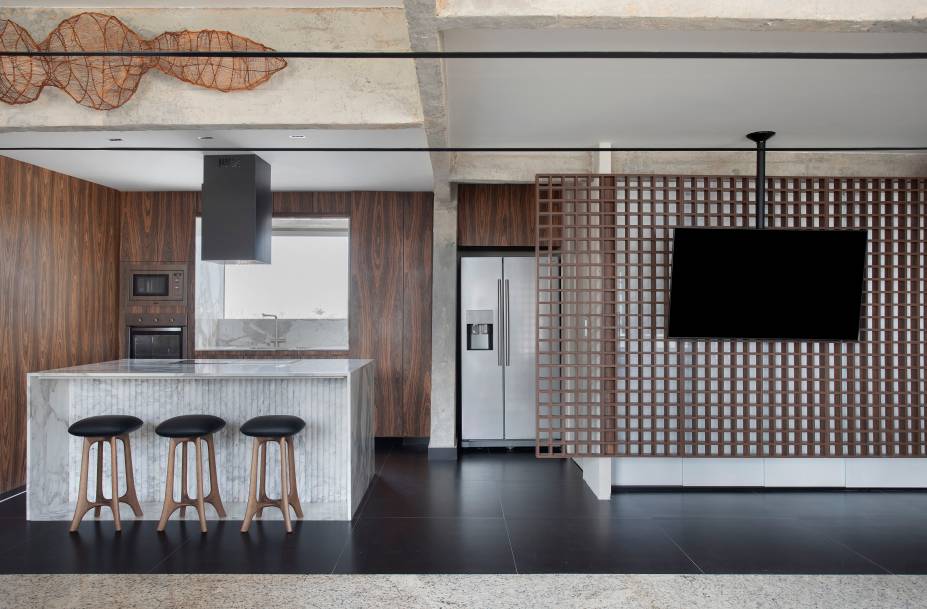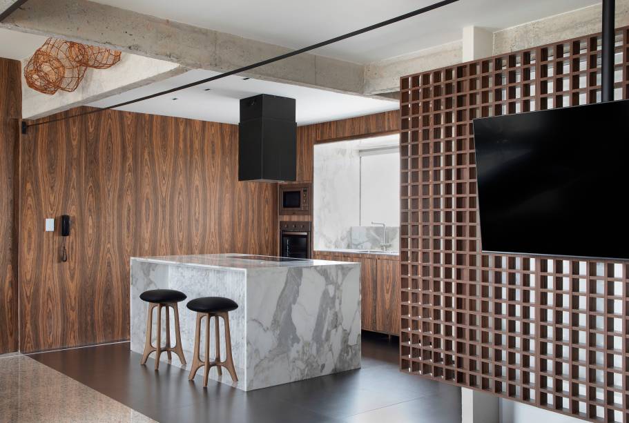 Ainda na área social, Roby também destaca que toda a marcenaria foi executada em lâmina natural de Pau-ferro, inspirada na mesa de apoio Pétala, assinada por Jorge Zalszupin. Na sala de tv, o painel de tv vazado, em formato de muxarabi, preserva a ventilação cruzada entre a lavandeira e a sala de estar.