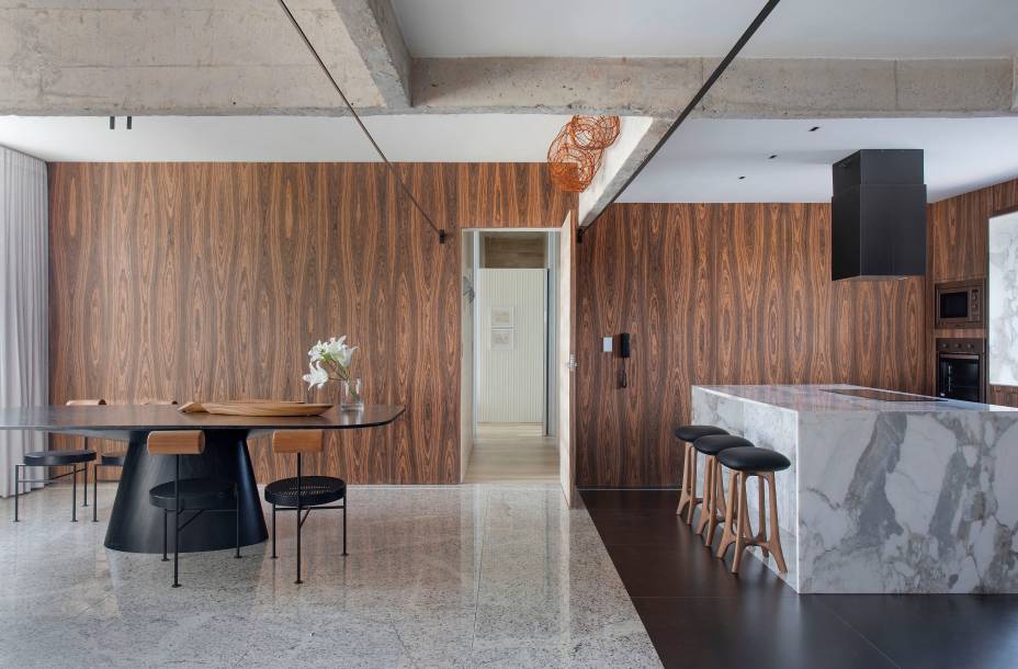 Reforma separa cozinha de estar e cria varanda gourmet com mesa de 3 m e 200 kg