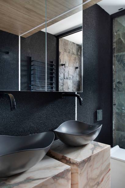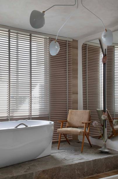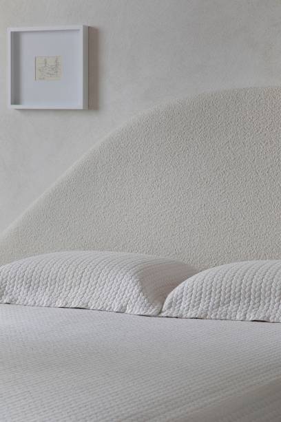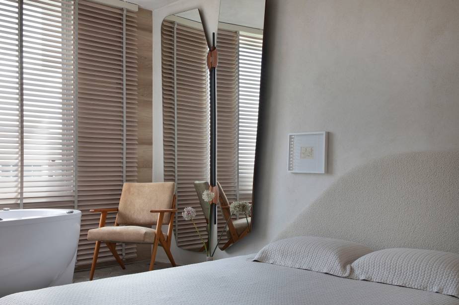 Já no quarto do casal, Roby destaca a cama em formato orgânico assinada por ele próprio, os três desenhos emoldurados de Tarsila do Amaral, o espelho de parede Milan assinado por Jader Almeida e a banheira sobre o deck de pedra bruta, próximo à janela, voltada para o mar.