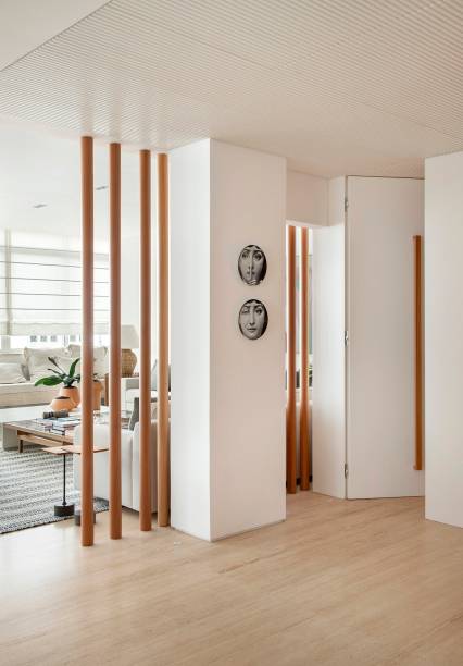Paleta de cores claras e ripados de madeira trazem leveza à apê de 275m²
