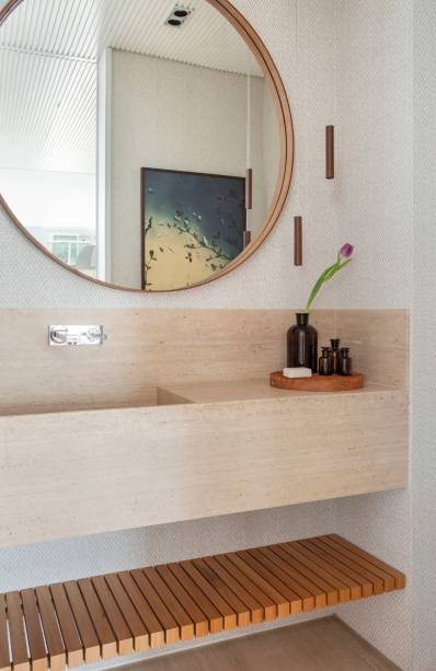 “O grande diferencial da área social é o banco fixo que se estende ao longo de toda a parede da janela, projetado por nós em concreto e revestido com a mesma pedra natural Travertino Navona do piso. Com 10 metros de comprimento, ele serve de apoio às salas de estar e TV e ajuda a integrar melhor os dois ambientes. Deixamos um lado dele propositalmente sem estofados para apoiar objetos, plantas e livros”, ressalta Paula.