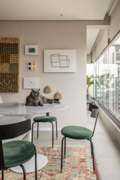 As cores aparecem na poltrona Lina e nas cadeiras de jantar e do gourmet. “Na hora de produzirmos o apartamento, escolhemos o tapete verde degradê da by Kamy e ousamos na sobreposição do tapete da Botteh, que tem um estilo mais vintage. Foi uma combinação que testamos na hora e adoramos o resultado”, dizem as profissionais.