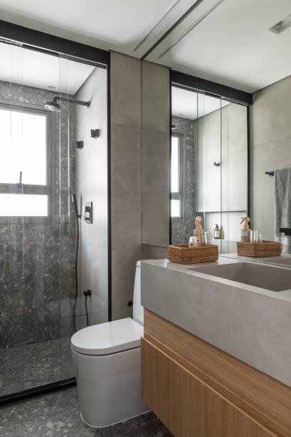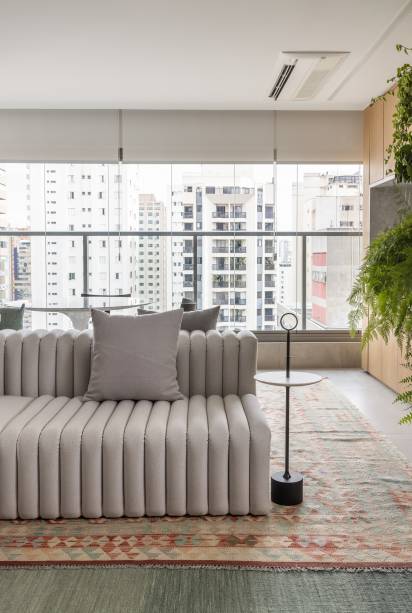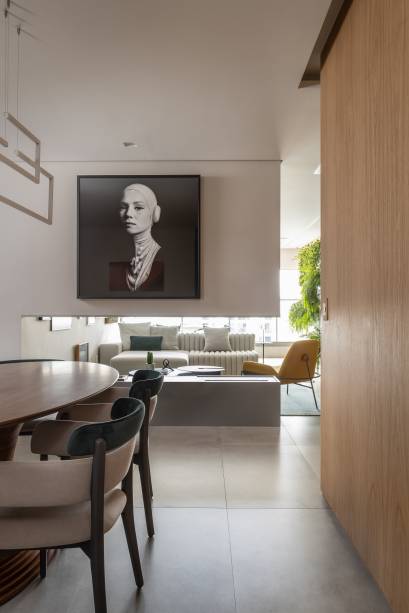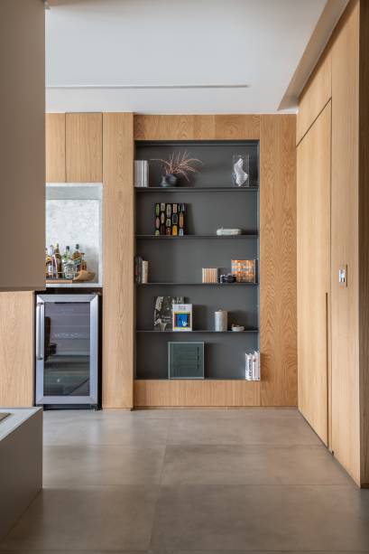 “Prezamos por algo bem neutro, com piso de textura de cimento queimado e uma marcenaria clara de carvalho na sala. Para o toque moderno, há pontos de serralheria escura, tanto na arquitetura quanto no mobiliário. Isso com certeza trouxe atualidade para o projeto”, explica o escritório.