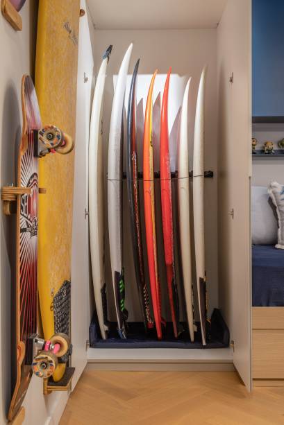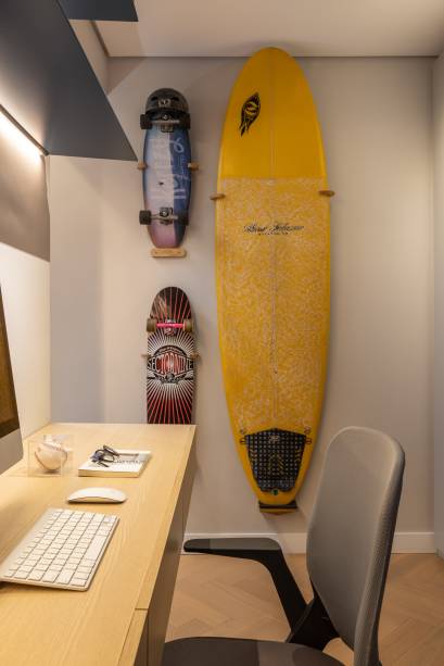 Já no home office, o clima é mais fun, com piso de madeira, marcenaria cinza com toque de azul e espaço para trabalhar, guardar as pranchas de surf e mostrar as coleções de bonequinhos.