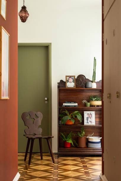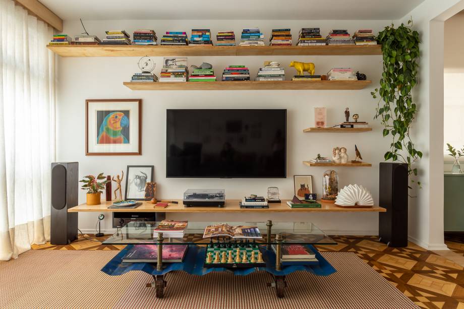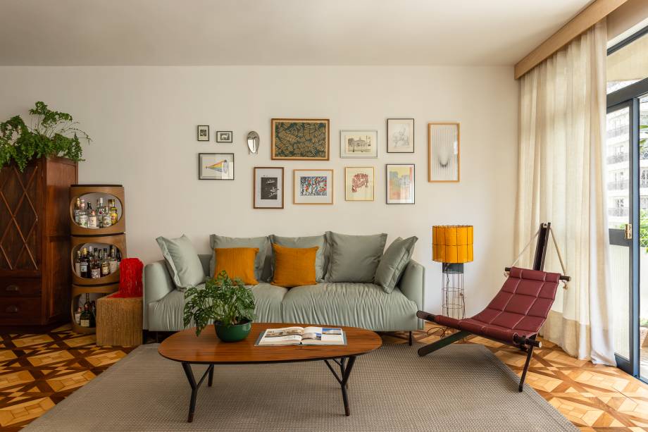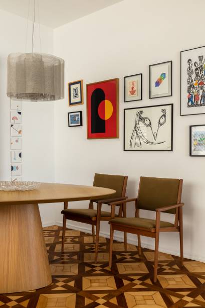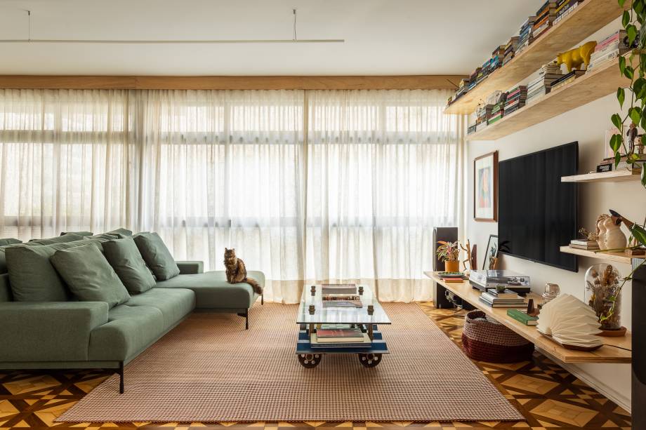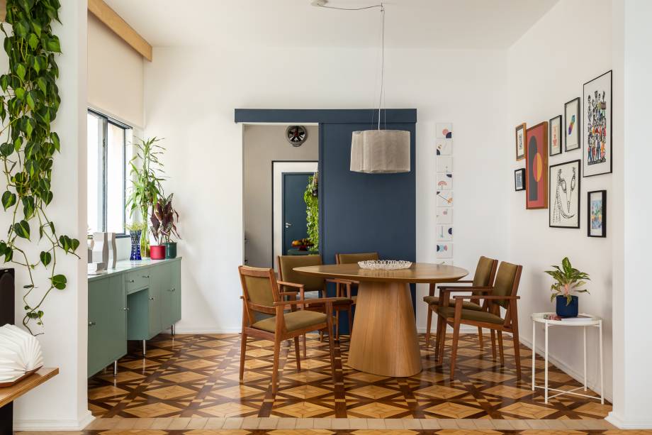 O piso de madeira original — um dos destaques do apartamento, devido ao padrão aplicado no material — foi restaurado, trazendo uma textura que carrega o tempo como parte da estética.