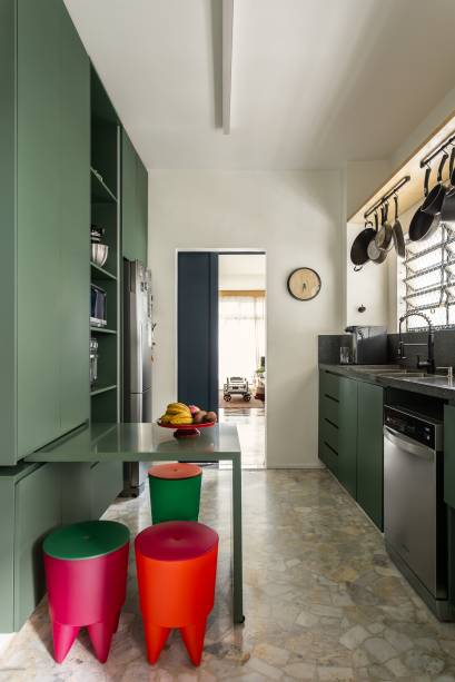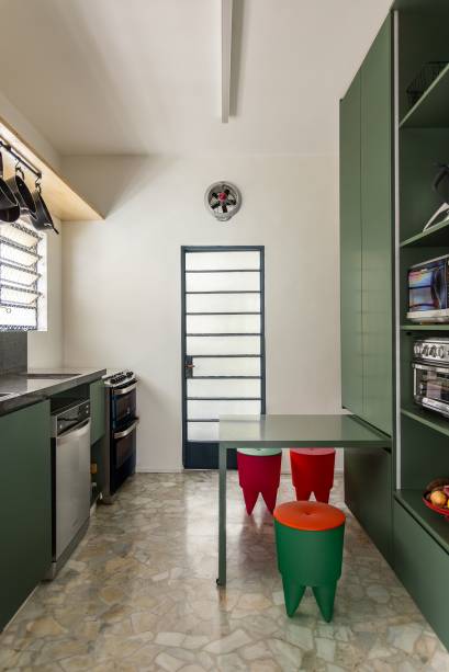 A cozinha, por sua vez, manteve seu caráter independente, mas ganhou permeabilidade visual através de uma porta de correr.