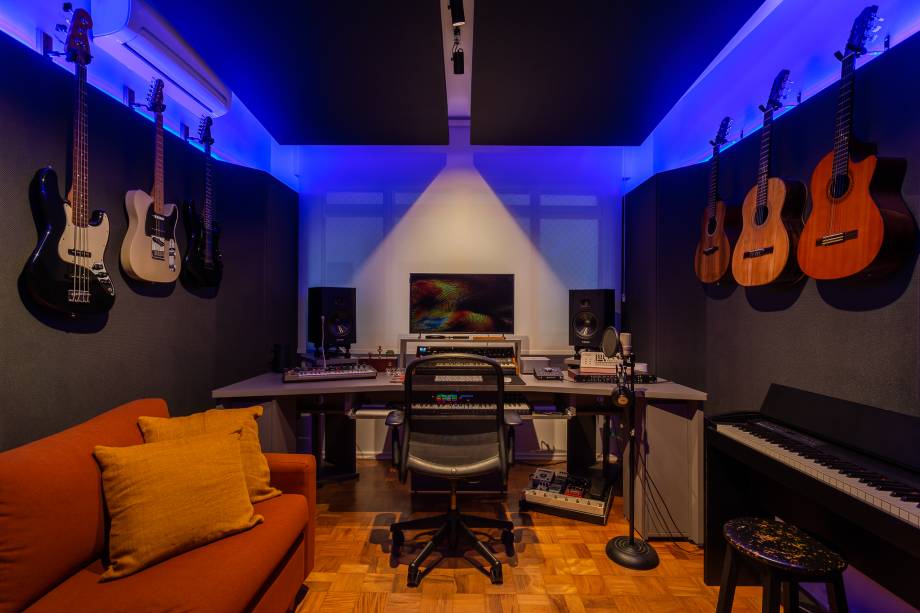 Já na área íntima, um dos antigos dormitórios foi convertido em suíte, enquanto outro cômodo se transformou em um estúdio musical, projetado com tratamento acústico específico para absorção sonora. O escritório, que também pode ser um quarto de hóspedes, adiciona flexibilidade à planta.