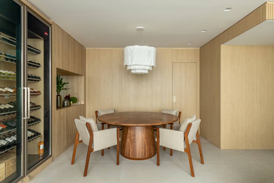 “O novo quarto agora ocupa uma parte da living e o segundo banheiro da suíte master”, contam as profissionais. Com área social reduzida, o desafio do escritório foi reunir a adega grande de vinhos, a lareira e os espaços para receber amigos no novo layout, sem deixar de lado o conforto. “Utilizamos o pé-direito duplo para valorizar e aumentar a sensação de amplitude do ambiente”, contam. O mezanino – fruto de uma reforma anterior – também recebeu reforço na estrutura.
