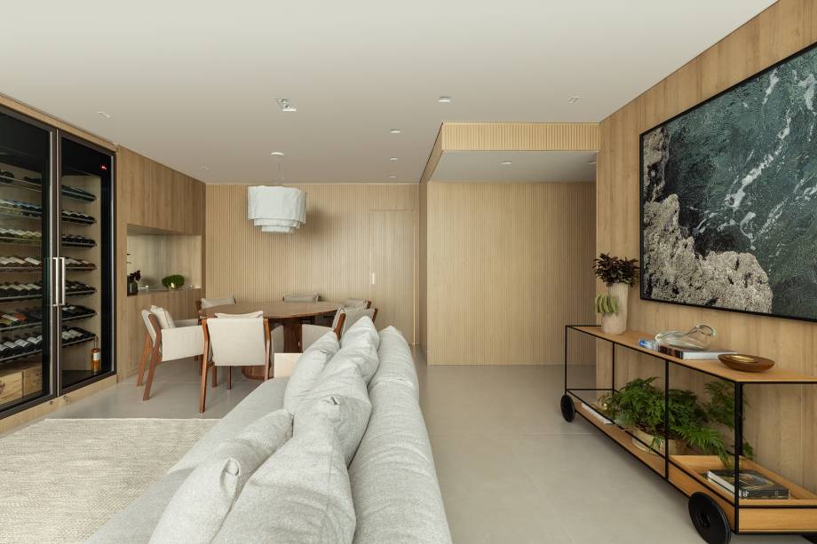 O desafio de Camila Gazola e Stefania Pinheiro foi reorganizar a área social em uma metragem menor, sem deixar de lado o conforto e a circulação fluida