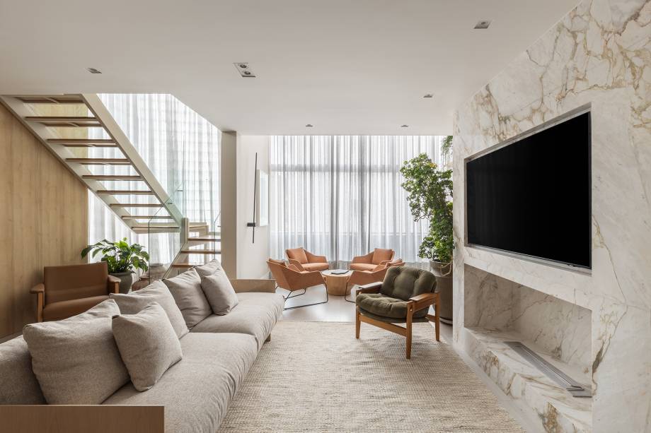 A sala recebeu painéis de marcenaria nas paredes com portas camufladas. A varanda integrada com fechamento de vidro provê iluminação natural, que ganha suavidade com cortinas de tecido transparente. A árvore da Felicidade foi presente da mãe do cliente e ganhou destaque especial.
