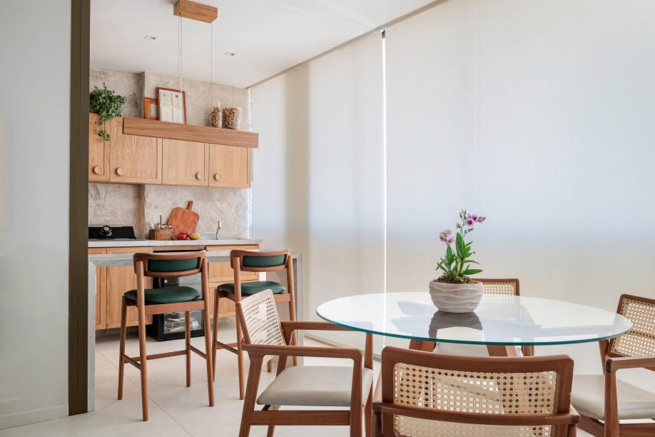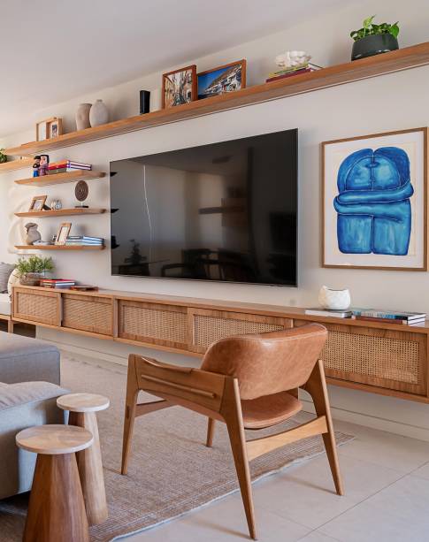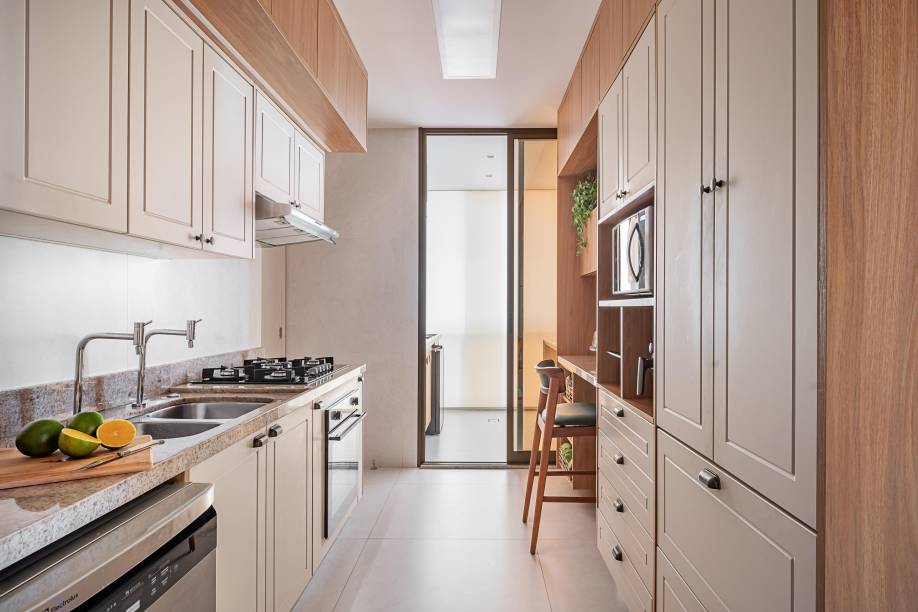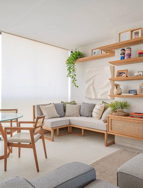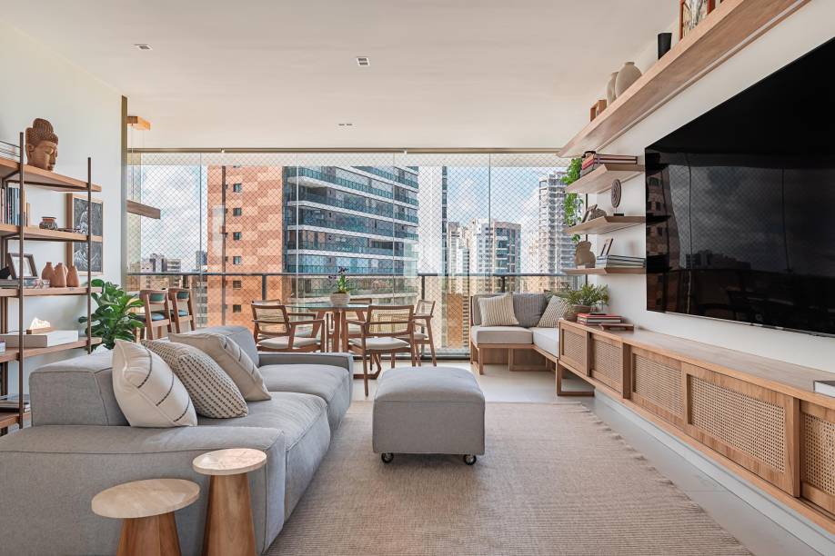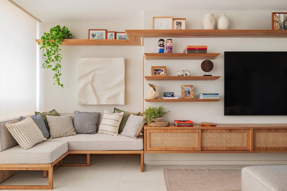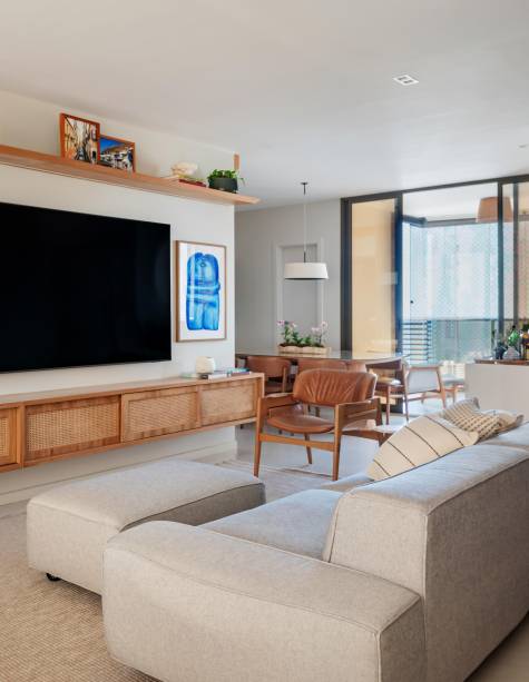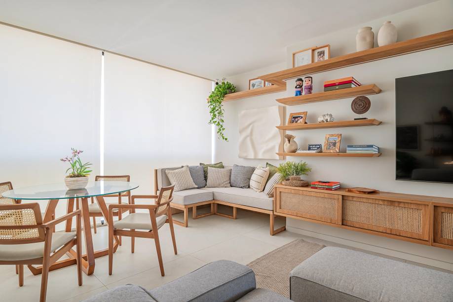 Nas áreas de convivência, a arquiteta adotou uma paleta com base clara, composta de tons neutros, a exemplo das paredes pintadas com tinta ouro branco, as marcenarias desenhadas por ela e executadas com acabamento em freijó natural e o piso de porcelanato em tom areia, instalado pela construtora.