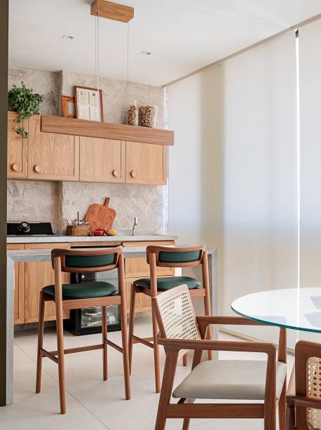 “Como eles não queriam fazer muita obra, pediram ainda para manter os revestimentos deixados pela construtora, mesmo não gostando da maioria deles. E que os revestimentos e materiais novos fossem práticos e resistentes por causa das crianças e da cadela”, acrescenta ela.
