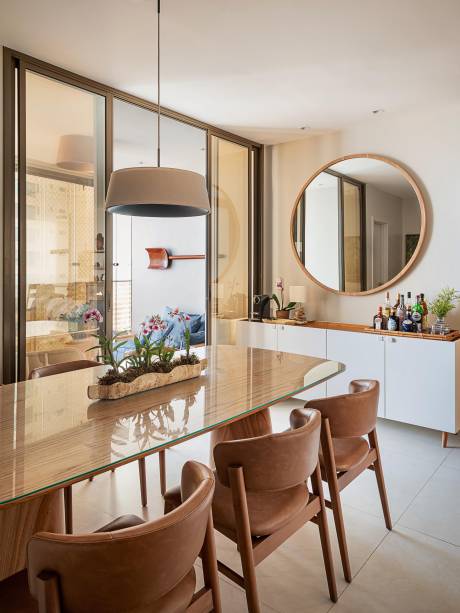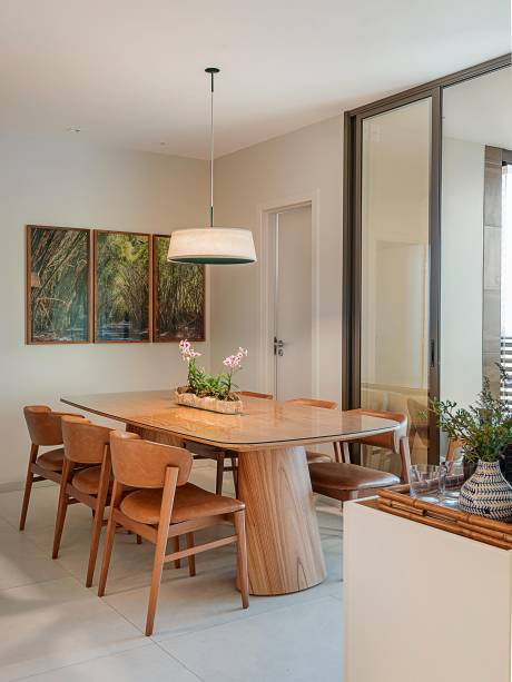 “A ideia era trazer um pouco da identidade e da história da família para que a decoração não ficasse com cara de showroom de loja”, diz a arquiteta. Como vários móveis que já faziam parte do acervo da família foram aproveitados, Juliana partiu dessas peças para especificar as novas, garantindo assim uma harmonia estética. Entre as novas aquisições, ela destaca a mesa, as cadeiras e a luminária pendente da sala de jantar e, na área de estar, a poltrona Theo, do designer Bruno Faucz, estofada em couro castanho.