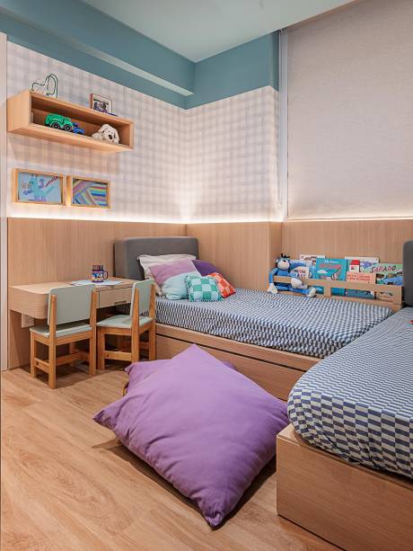 Já os ambientes infantis receberam piso vinílico amadeirado, marcenarias em carvalho e toques de cor para deixar esses espaços mais lúdicos e acolhedores. Posicionada ao lado da estante da sala, a escultura de parede branca com superfície ondulada é uma criação do artista visual Mário Lopomo.