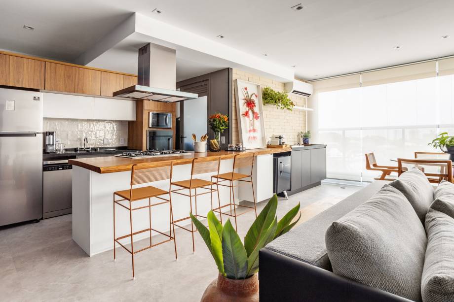 A sala, cozinha e área gourmet são integradas. O piso vinílico marmorizado e os móveis de madeira servem como elementos de ligação visual entre os cômodos. Na cozinha americana destacam-se os tons de cinza e a ilha com bancada em formato orgânico.