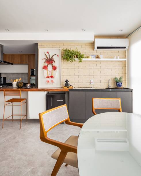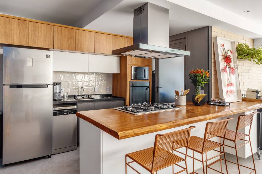 Com estilo contemporâneo clean, a decoração tem tons neutros e designs rústicos e industriais.