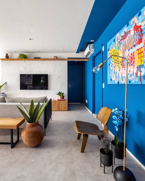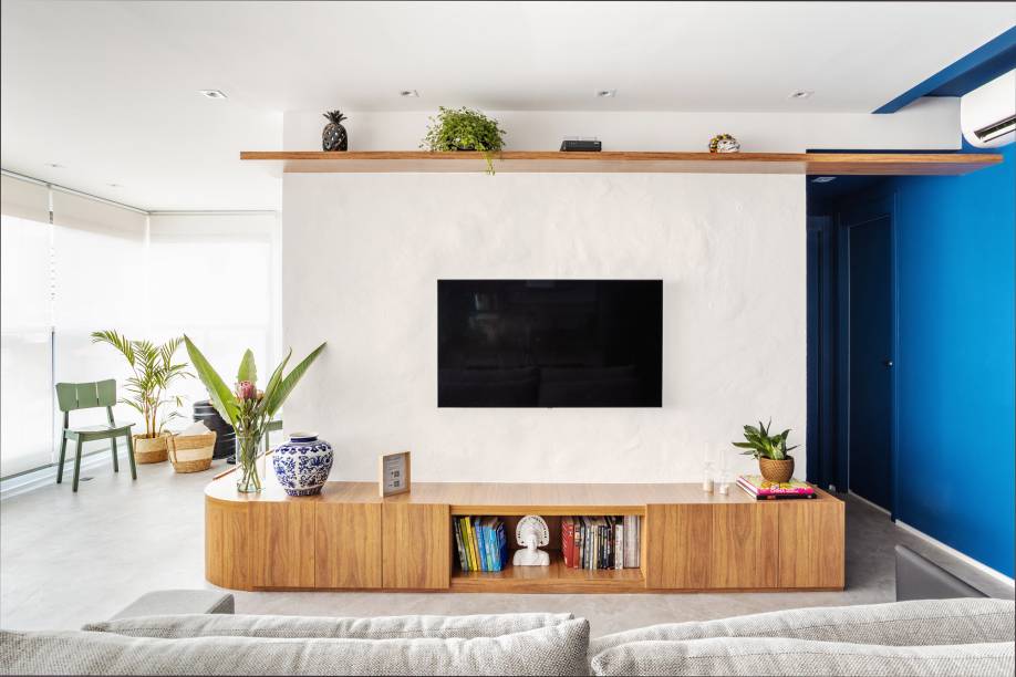“Utilizamos madeira, cores em tons de azul e terracota que contrastam entre os tons e texturas aplicados. Usamos diferentes texturas, principalmente em revestimentos e pintura, aplicamos a pintura caiada criando uma textura como painel de TV contrastando com a madeira do rack, os tijolinhos harmonizam a varanda e a sala de forma rústica e clean”, explicam os profissionais.