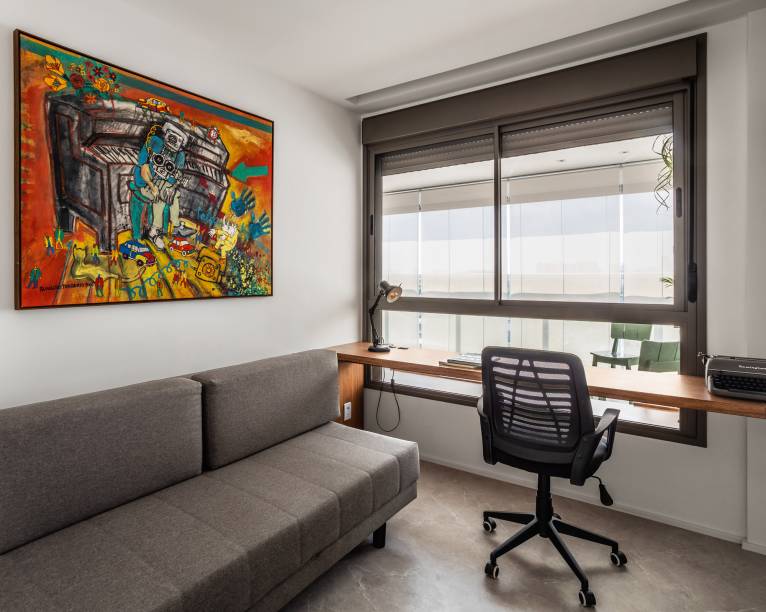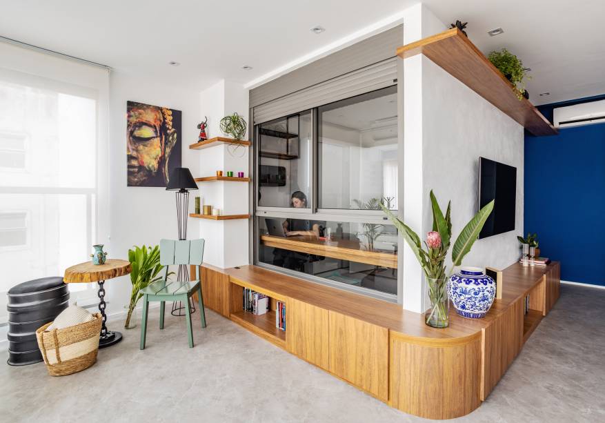 As linhas curvas aparecem no living com o rack curvo, que abraça o home office.