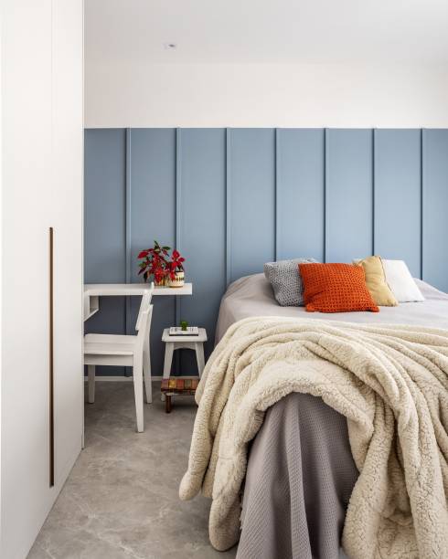 Na parte íntima, o quarto de casal traz o tom azul na cabeceira e o mesmo piso vinílico da área social. Uma mesinha lateral branca e spots para a iluminação completam o cômodo.