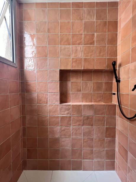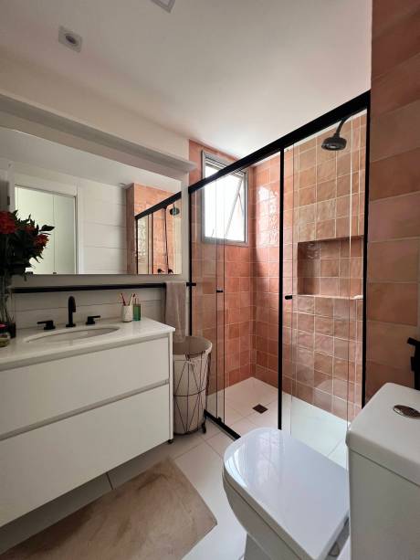 No banheiro a decoração segue a linha mais industrial, com metais pretos, revestimento colorido e gabinete branco.