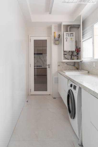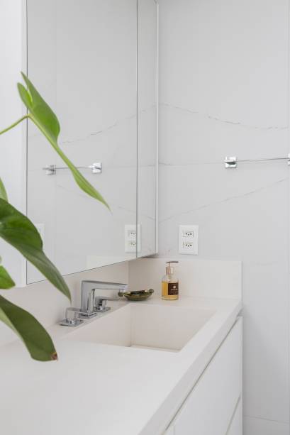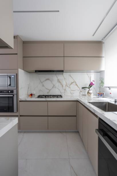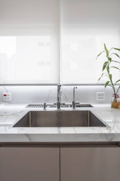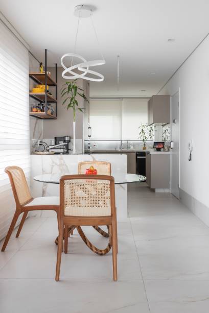 A área gourmet conta com uma adega para vinhos e café – duas paixões dos moradores, com um mobiliário planejado para expor as taças e um vaso com a árvore da felicidade na entrada da cozinha. A cozinha e a copa também foram integradas, seguindo uma linha clean e cinza, com uma luminária em formas sinuosas, eletrodomésticos embutidos e armários funcionais.