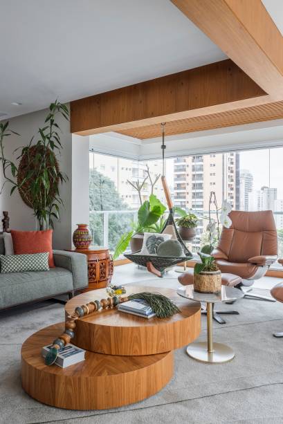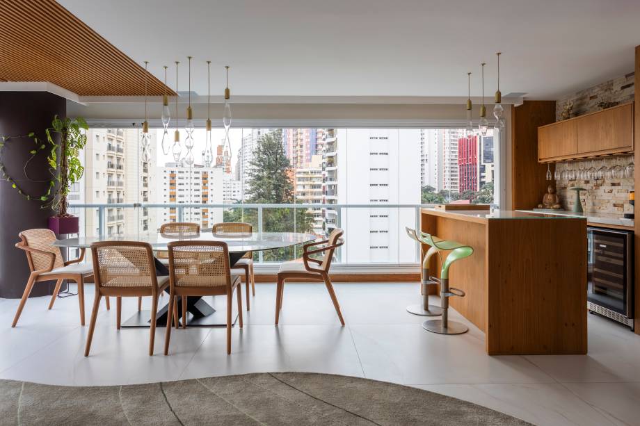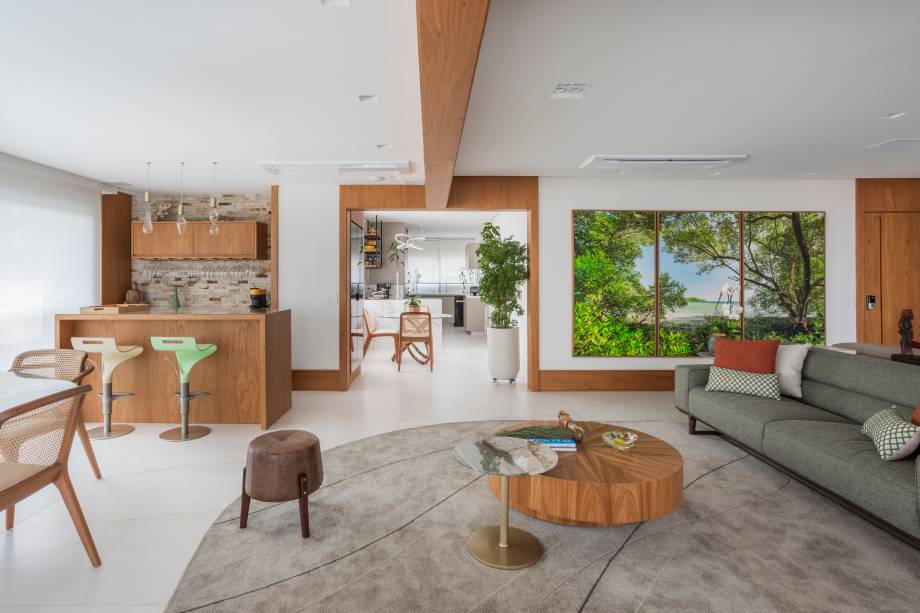 A arquiteta Carol Gonçalves, do escritório Tatu Arquitetura, apostou em mobiliário com formas orgânicas e ambientes integrados