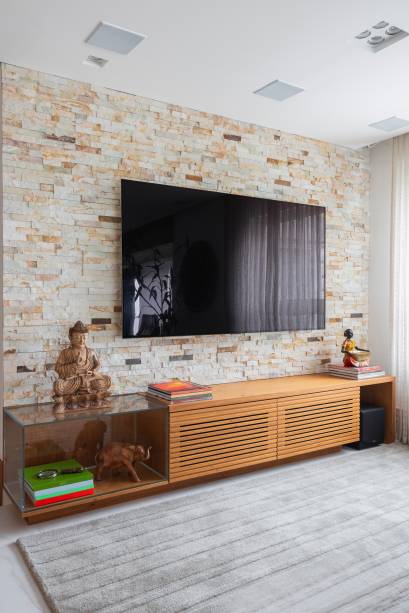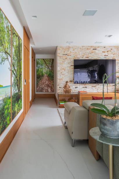 Este apartamento de 201m², com vista para o parque Ibirapuera em São Paulo, recebeu um projeto assinado pela arquiteta Carol Gonçalves, do escritório Tatu Arquitetura, com plantas e quadros de paisagens do artista Melo Bastos como elementos decorativos. As cores e as texturas dos materiais escolhidos entram em harmonia com o verde da vista externa e criam uma atmosfera de tranquilidade e bem-estar.