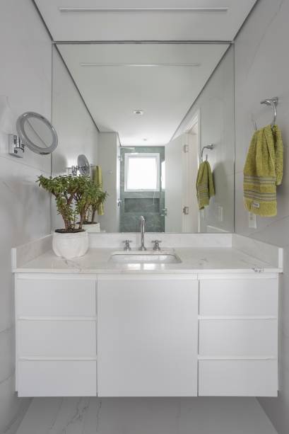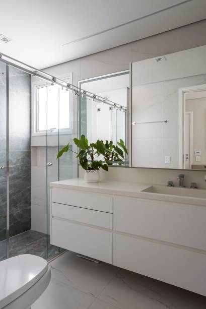 Nos banheiros, foram instalados espelhos camarim e espelhos articuláveis, que proporcionam mais praticidade e iluminação adequada para as atividades diárias. Todo o apartamento possui automação, desde a iluminação até as persianas, para facilitar o dia a dia dos moradores e garantir mais conforto e segurança.