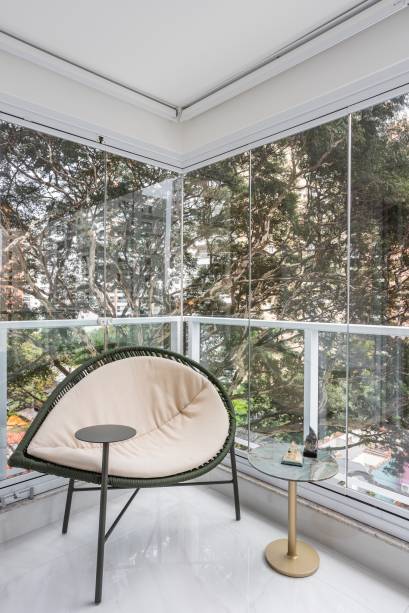 Na varanda, um cantinho de descanso foi criado com uma poltrona de balanço e muitas plantas, como a famosa orelha de elefante, a jasmim manga, a clusia variegata e as marantas. As amplas janelas permitem a entrada de luz natural e ventilação, além de integrar o ambiente com o exterior.