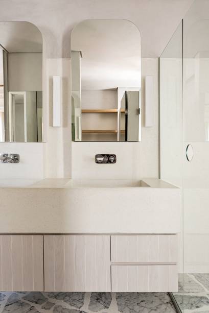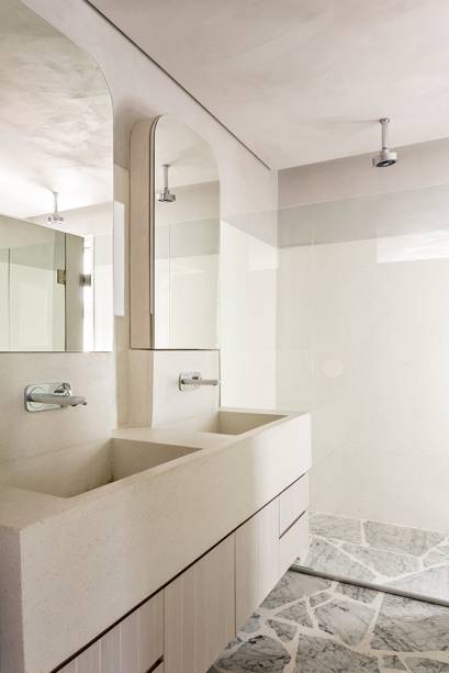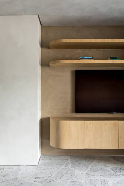 A madeira com detalhes arredondados foi pensada para ser clean e funcional, seguindo o conceito arquitetônico. Esta abordagem minimalista está presente em todos os projetos do estúdio: cores neutras, espaços abertos e o mínimo de decoração possível. Materiais como mármore e rejuntes de mosaico dão os toques finais de elegância.