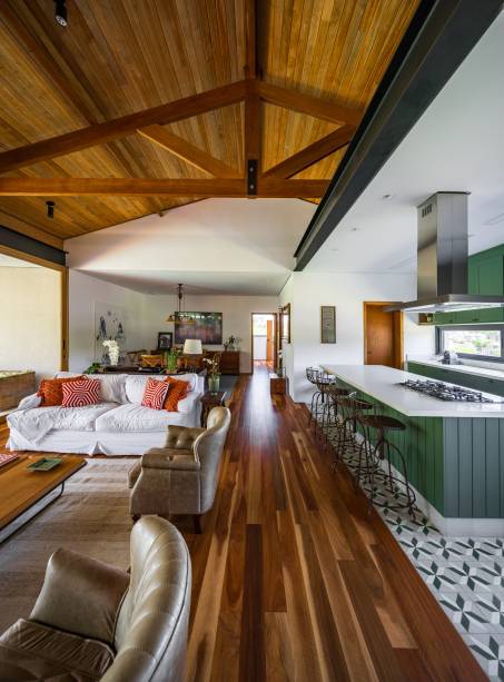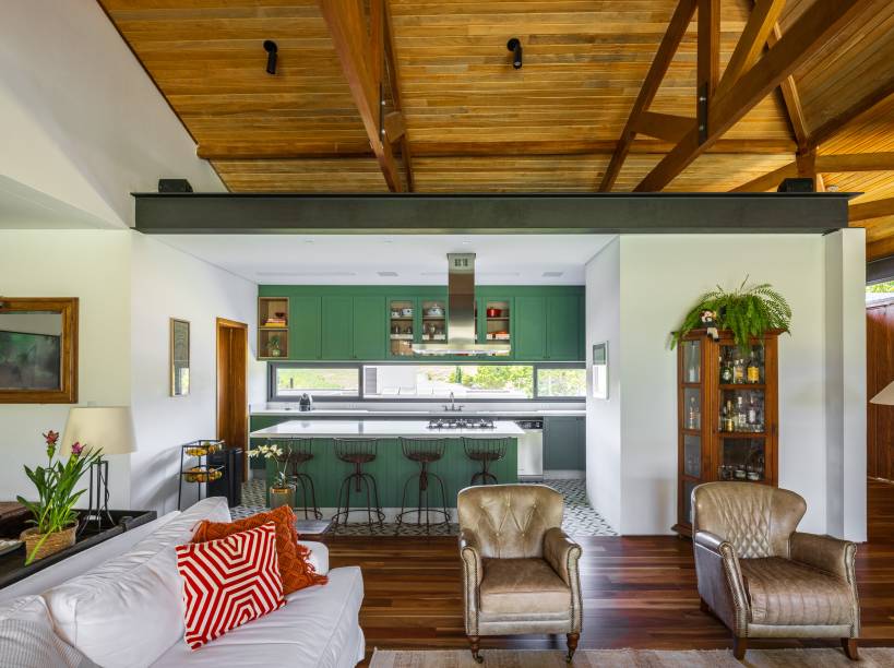 Em uma justa harmonia entre o rústico e o contemporâneo, a marcenaria verde e o desenho do ladrilho hidráulico proporcionam uma viagem no tempo. A ilha central recebe destaque, projetada como ponto central no ambiente, setoriza o programa em conceito aberto, e promove funcionalidade no uso diário com a instalação do cooktop e coifa de teto.