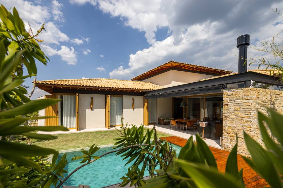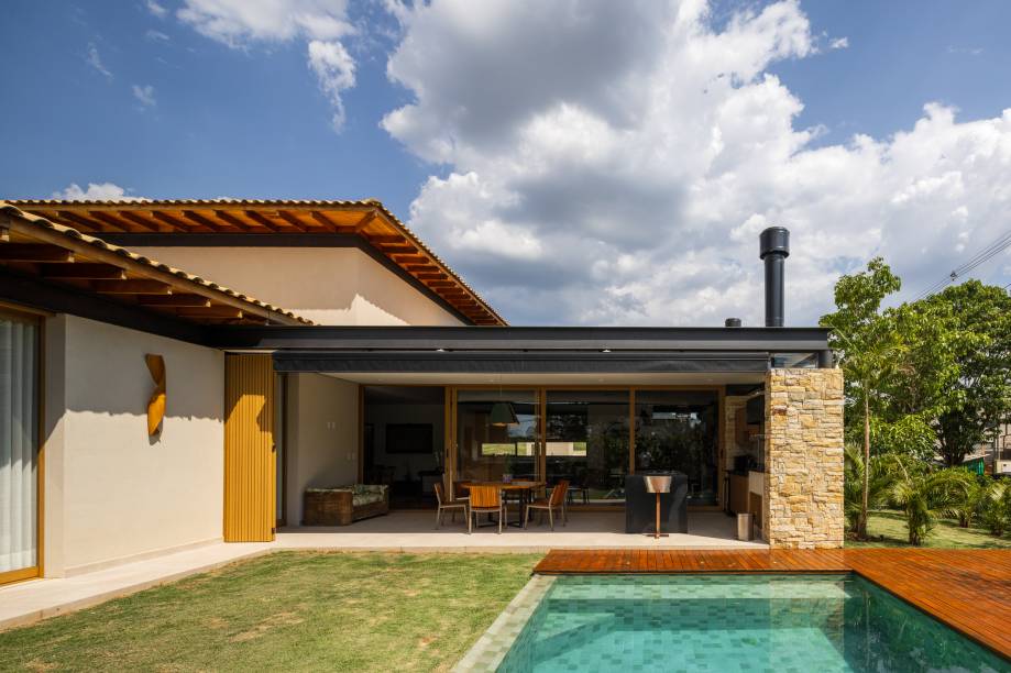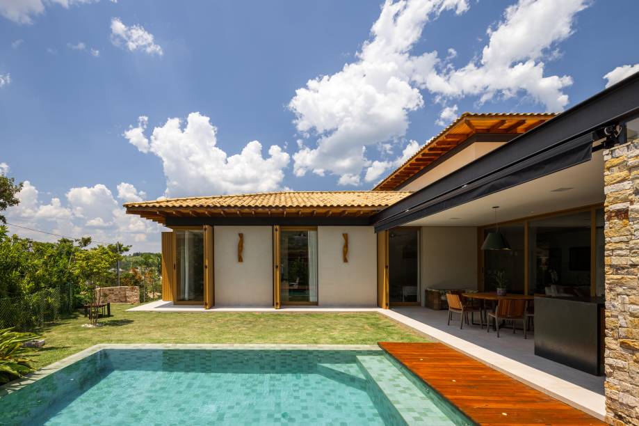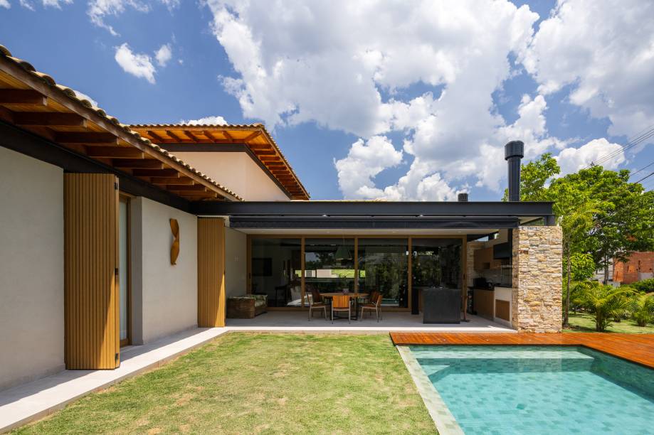 A varanda gourmet projetada pelo arquiteto prevê uma área de preparo bem planejada, churrasqueira de alta qualidade, bancadas amplas e uma extensa mesa de jantar que acomoda todos com facilidade. Centralizada, a piscina é envolta pelo gramado, deque de madeira e paisagismo, tornando-se um espaço agradável tanto nos dias de calor, quanto pela chance de apreciar todo o conjunto nos dias em que um mergulho não é opção.