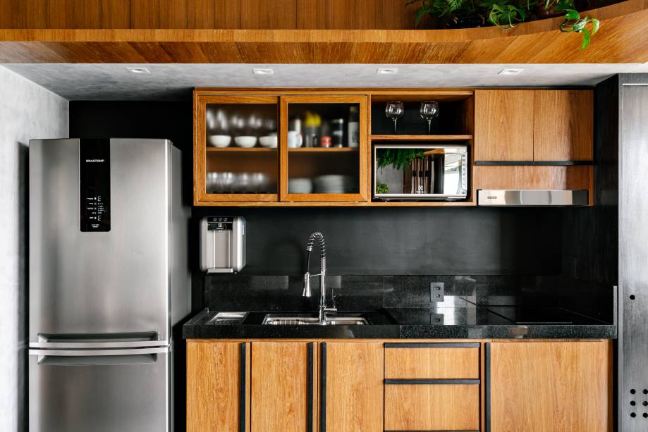 Na cozinha o contraste do cumaru com a cor preta do granito São Gabriel, que se conecta à bancada externa da varanda através de um armário utilitário em folha de black wood, rouba a cena.